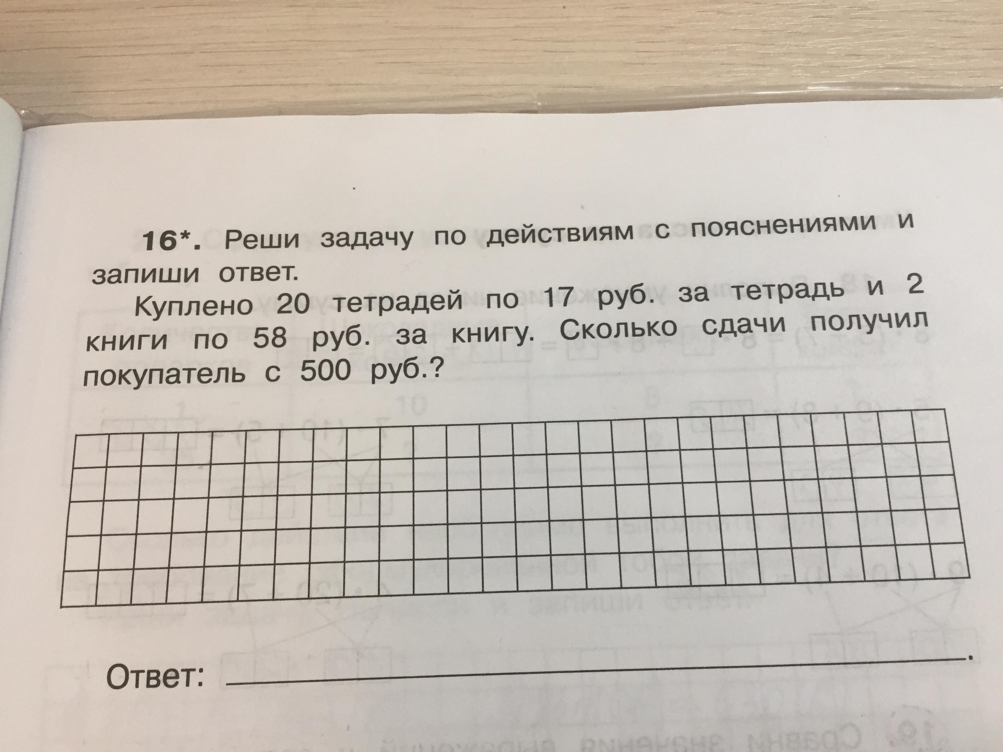 Куплено 20 тетрадей по 17 руб. за тетрадь и 2 книги по 58 руб. за книгу. Сколько сдачи получит покупатель с 500 руб.?
