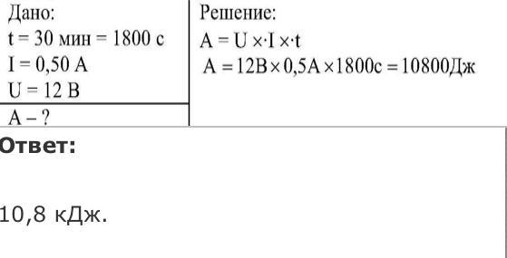 какую работу совершает ток за 30 минут, если сила тока в цепи 0,5 а, а напряжение 12 Вт? Решите пожалуйста)))