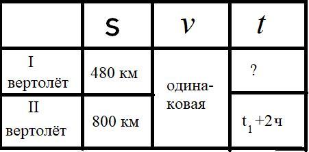 Первый вертолёт пролетел 480 км, а второй --- 800 км. Первый вертолёт был в полете на 2 ч меньше чем второй. Сколько часов был в полете каждый вертолет, если их скорости были одинаковой?