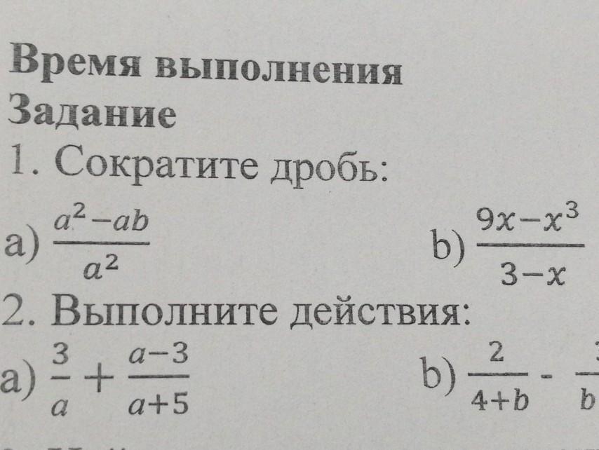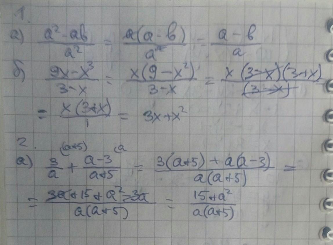 а). a^2-ab / a^2=a*(a-b) /a^2=(a-b) / a. Ответ: (a-b) / a. б). 9x-x^3 / 3-x=x*(9-x^2) / 3-x=x*(3-x)*(3+x) / (3-x)=x*(3+x)=3x+x^2. Ответ: 3x+x^2. ^-это степень. / -черта дроби.