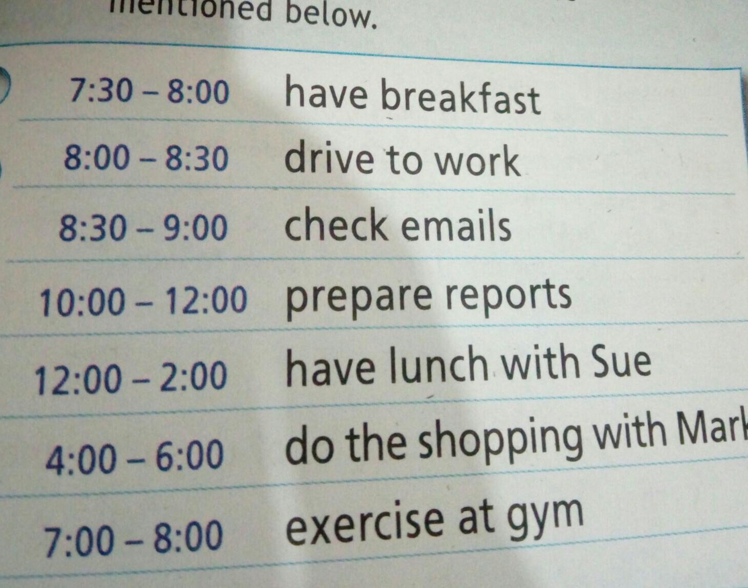 5. No, Ann wasn't doing the shopping with Mark at 1:30. She was having lunch with Sue
