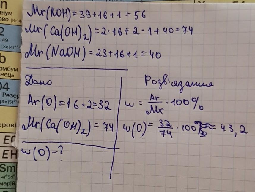 Обчисліть відносні молекулярні маси калій гідроксиду,кальцій гідроксиду і натрій гідроксиду.Обчисліть масову частку Оксигену в кальцій гідроксиді.