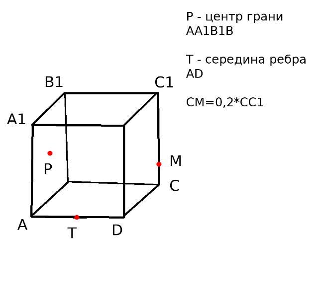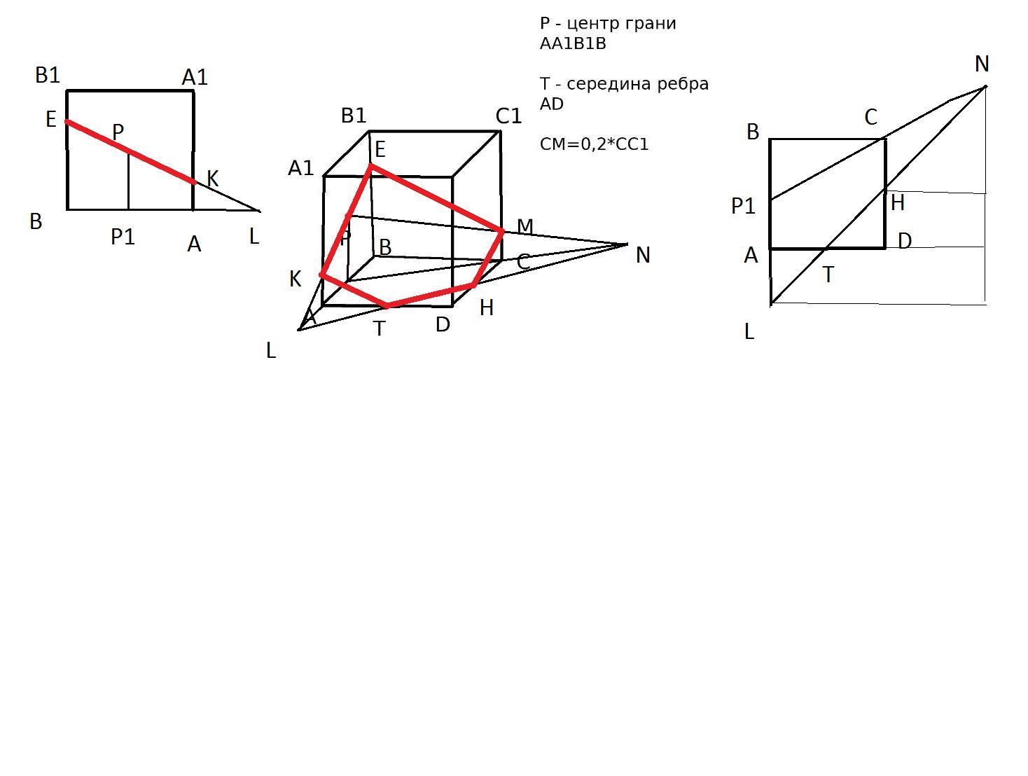 Постройте сечение куба плоскостью, проходящей через точку Р – центр грани AA₁B₁B, точку Т – середину ребра AD и точку М на ребре СС₁, такую что CM = 0,2*CC1. Найдите в каких отношениях сечение делит ребра куба, которые оно пересекает.