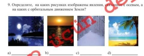 На картинке а ночь, на b закат. Смена времени суток связана с вращением земли по своей оси, а от орбитального движения зависят временя года, то есть картинка c. На картинке d пляж с пальмой, в тропических регионах лето почти круглый год