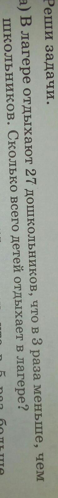 В лагерь отдыхают 27 дошкольников, что в 3 раза меньше чем школьников. Сколько всего детей отдыхают в лагере.