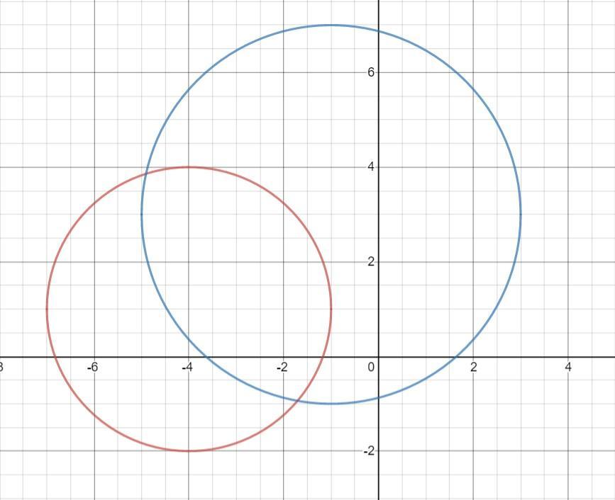выполнив построение выясните взаимное расположение двух окружностей заданных уравнениями( x+4)^2+(y-1)^2=9 и (x+1)^2+(y-3)^2=16