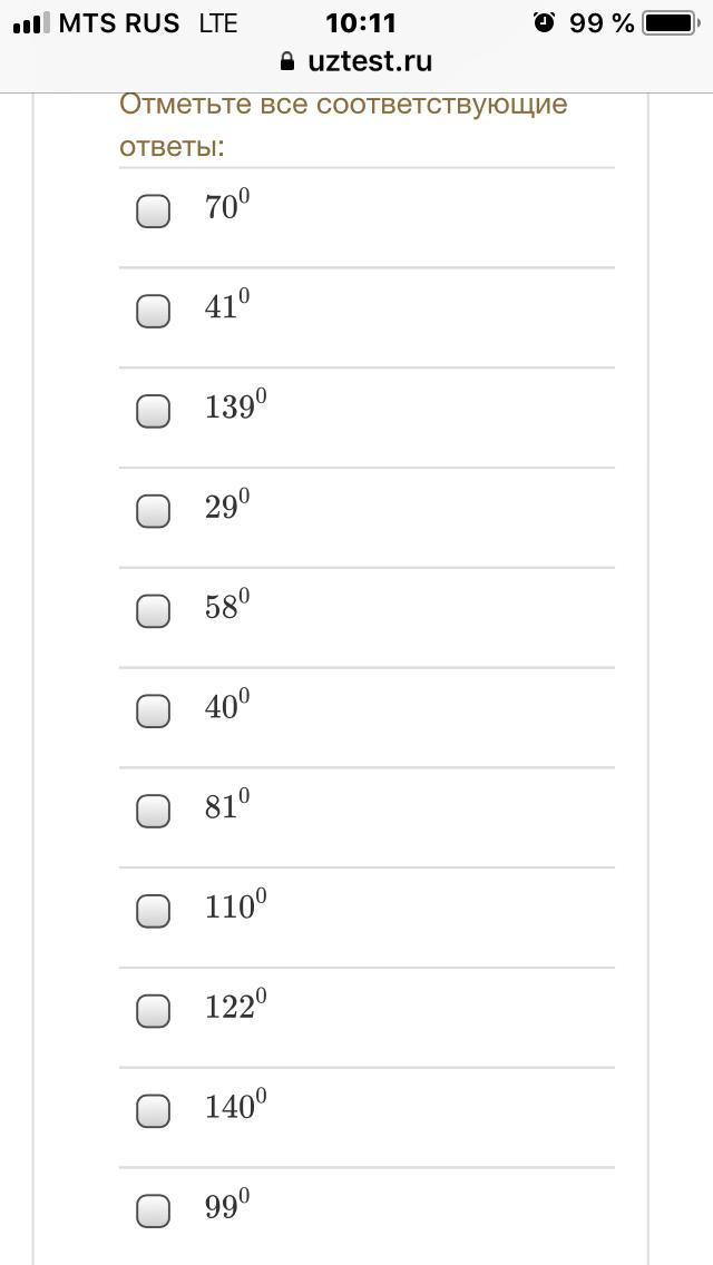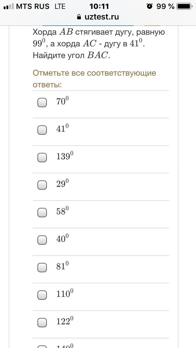 Хорда AB стягивает дугу, равную 99, а хорда AC – дугу в 41. Найдите угол BAC, отметьте все возможные ответы