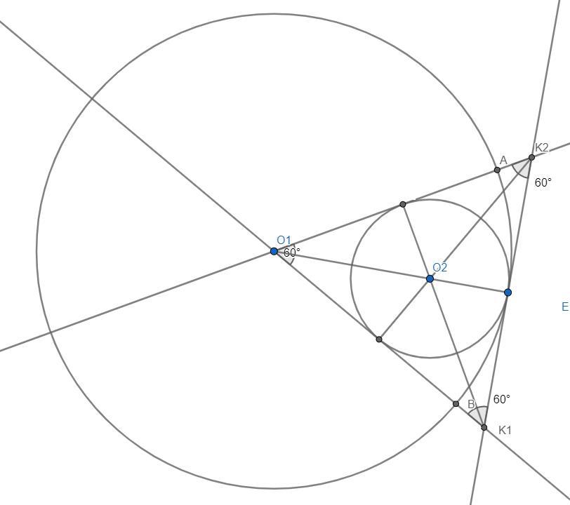 1)Проведем общую касательную к обеим окружностям и продлим стороны и O1B до пересечения с общей касательной в точках K1 и K2.