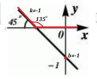 Угловой коэффициент k=tgα . Если k<0 , то угол α между прямой и осью ОХ - тупой. Так как из рисунка видно, что α=180°-45°=135° - тупой, то в уравнении k=tg135°= -tg45°=-1 <0 .