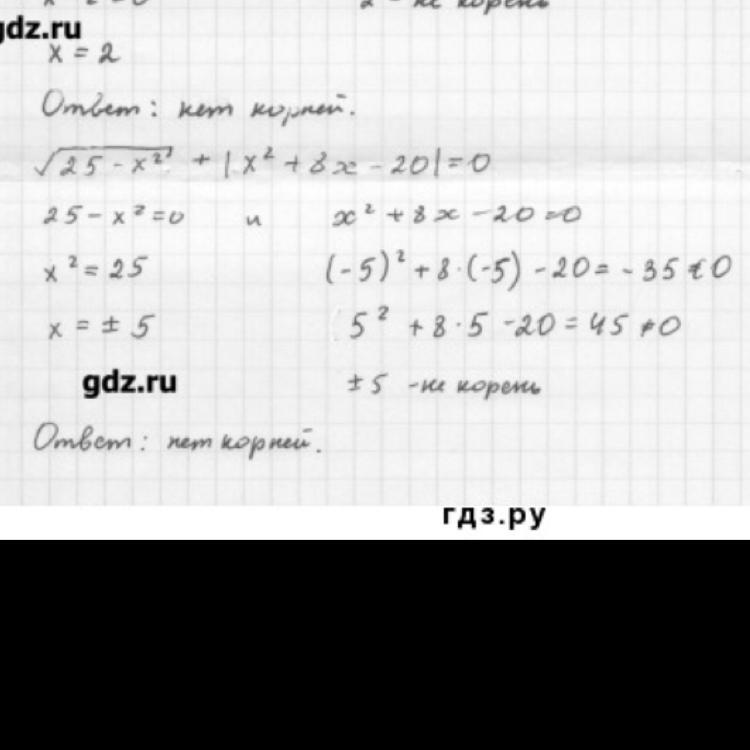 Мы имеем сумму двух выражений, каждое из которых больше или равно нулю. Сумма этих выражений может равняться нулю, когда равны нулю одновременно оба выражения. Но, когда первое выражение равно нулю в точках х=+-5, второе выражение в данных точках не равно нулю. Значит решений нет.