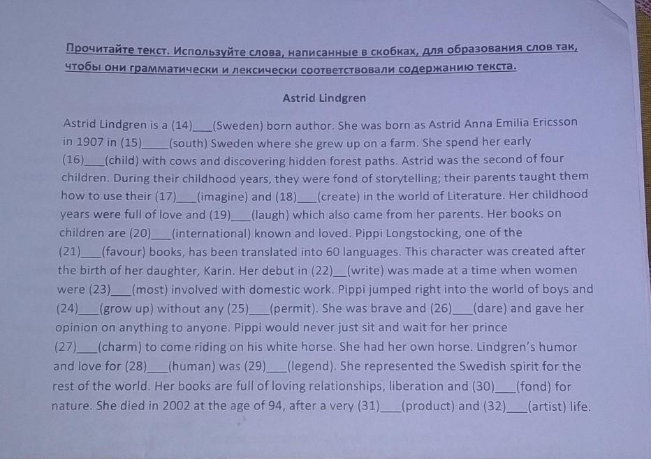 Astrid Lindgren is a (14)_(Sweden) born author. She was born as Astrid Anna Emilia Ericsson