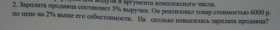 Зарплата продавца составляет 5 % выручки. Он реализовал товар за 6000р, по цене на 2 % выше его себестоимости. На сколько повысилась зарплата продавца?