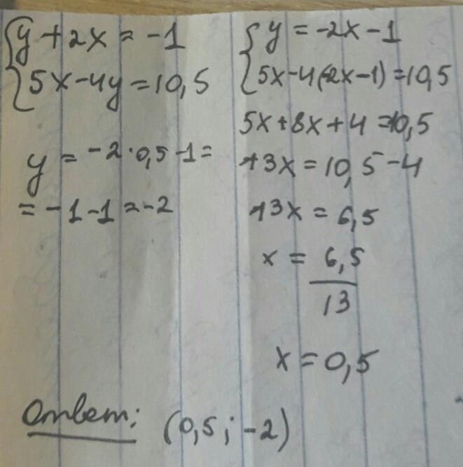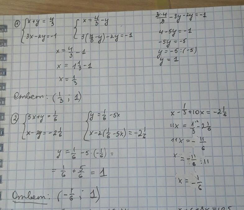 Найдите решение систем уравнений 1) {x + y = 4/3, 3x - 2y = -1 2) {5x + y = 1/6, x - 2y = -2 1/6 3) {y + 2x = -1, 5x - 4y = 10,5