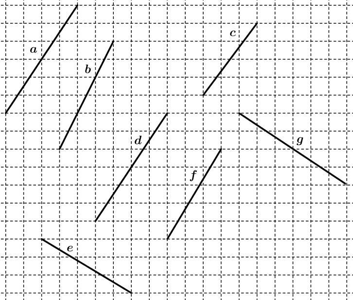 Выберите все прямые, для каждой из которых на рисунке есть параллельная ей прямая. Например, если параллельны пары прямых a и b, a и c, b и c, d и e, то нужно выбрать a, b, c, d, e.