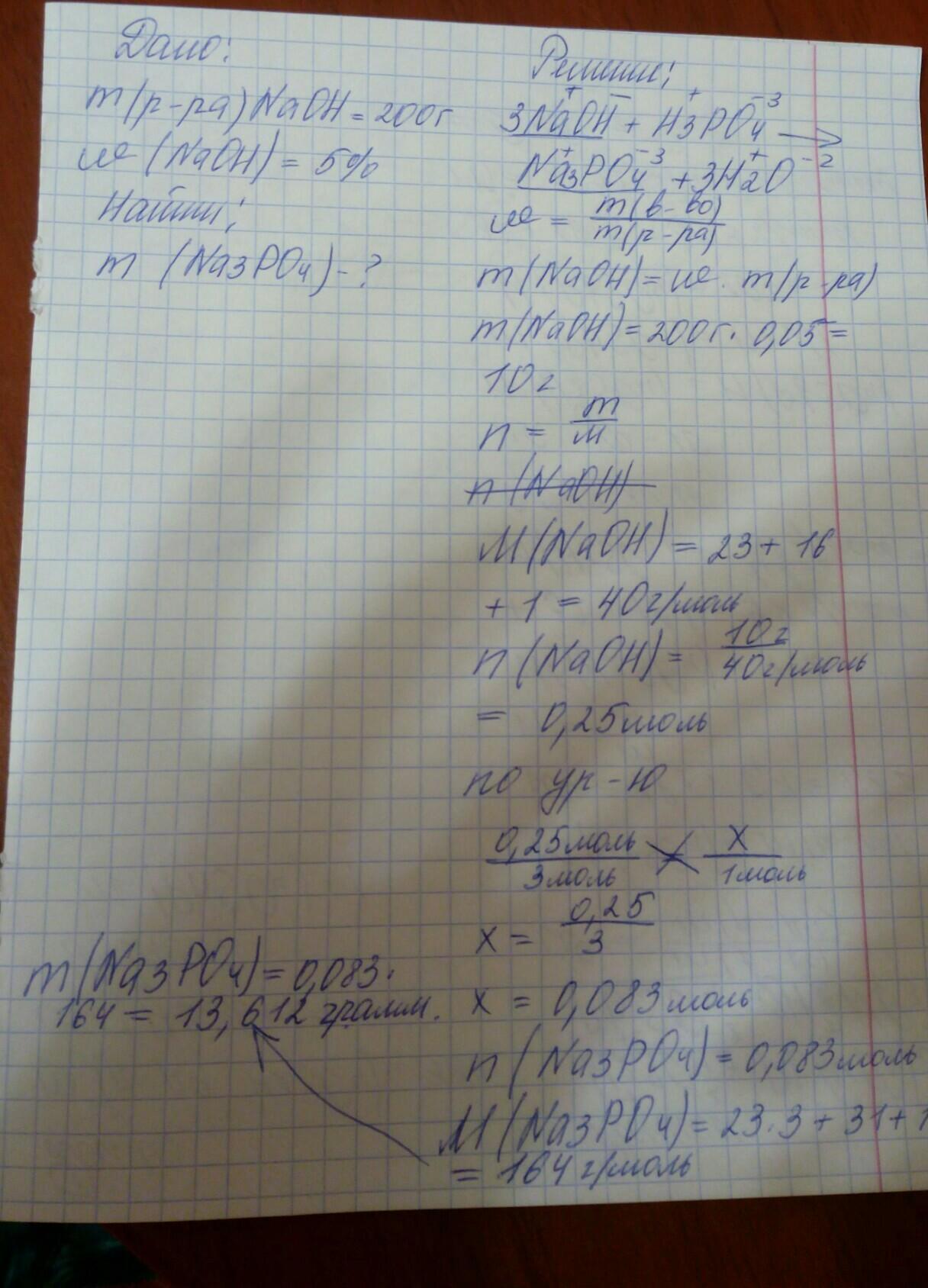 Какая масса соли образуется при взаимодействии 200г 5%-го раствора NaOH с фосфорной кислотой.