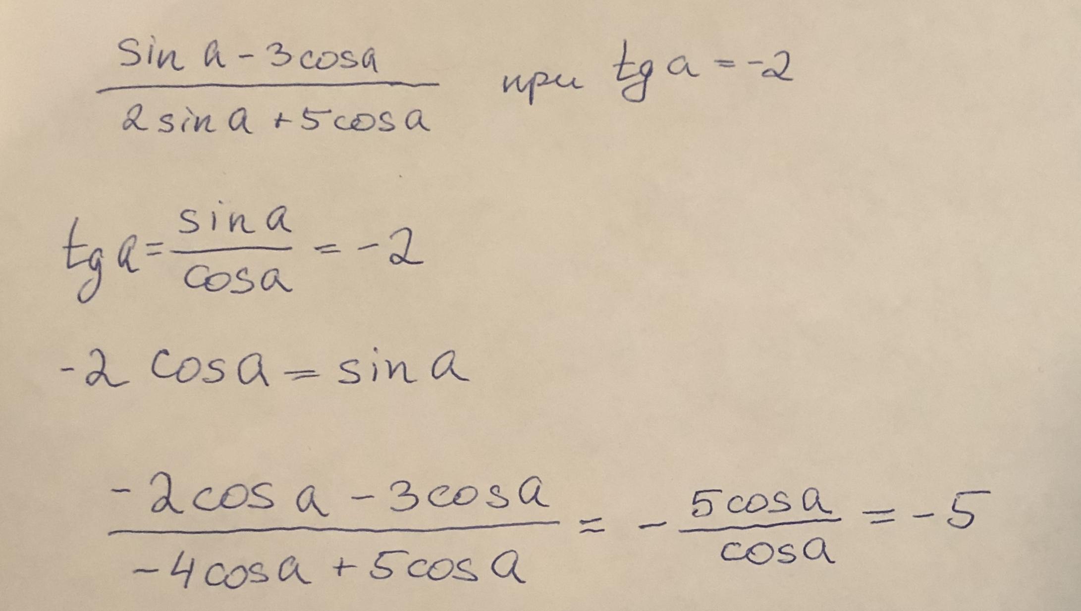 Так как отношение синуса а к косинусу а равно тангенсу а, оно равно и -2. Отсюда выражаем, например, синус а и подставляем в исходное выражение, косинусы в итоге сокращаются (мы знаем, что косинус а не равен нулю, в ином случае тангенс а не имеет смысла).