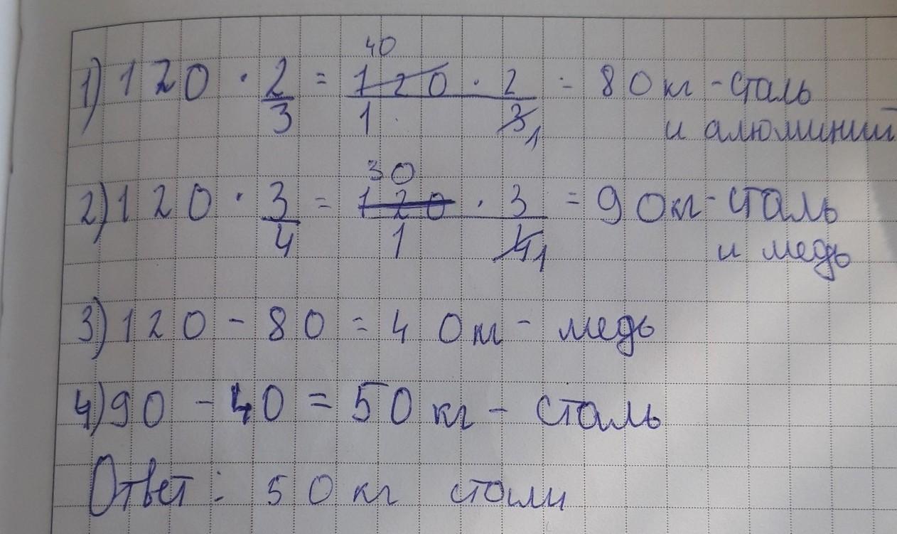 Аппарат весит 120 кг. Он сделан из стали, алюминия и меди. Сталь и алюминий составляют 2/3, сталь и медь - 3/4. Сколько кг стали пошло на изготовление аппарата?