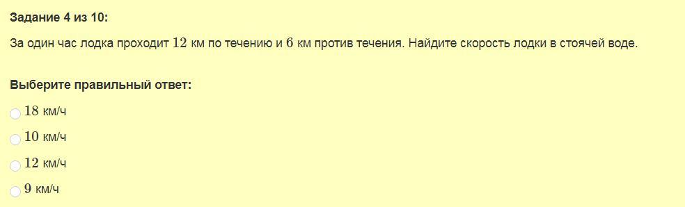 За один час лодка проходит 12 км по течению и 6 км против течения. Найдите скорость лодки в стоячей воде.