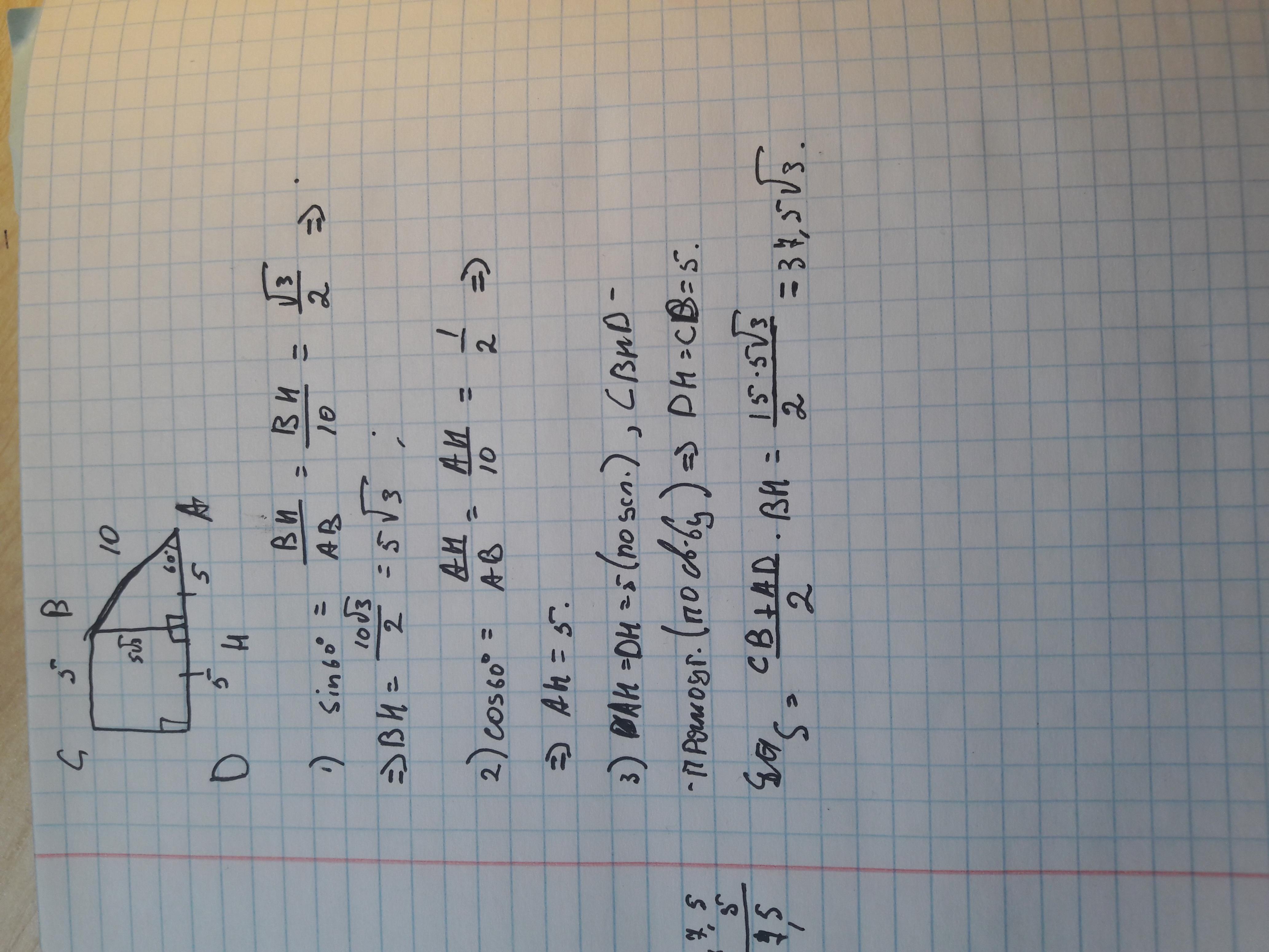 В прямоугольной трапеции ABCD Большая боковая сторона равна 10 см угол A=60 градусов а высота BH делит основание AD пополам. Найдите площадь трапеции