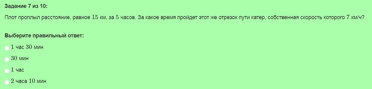 Плот проплыл расстояние, равное 15 км, за 5 часов. За какое время пройдет этот же отрезок пути катер, собственная скорость которого 7 км/ч?