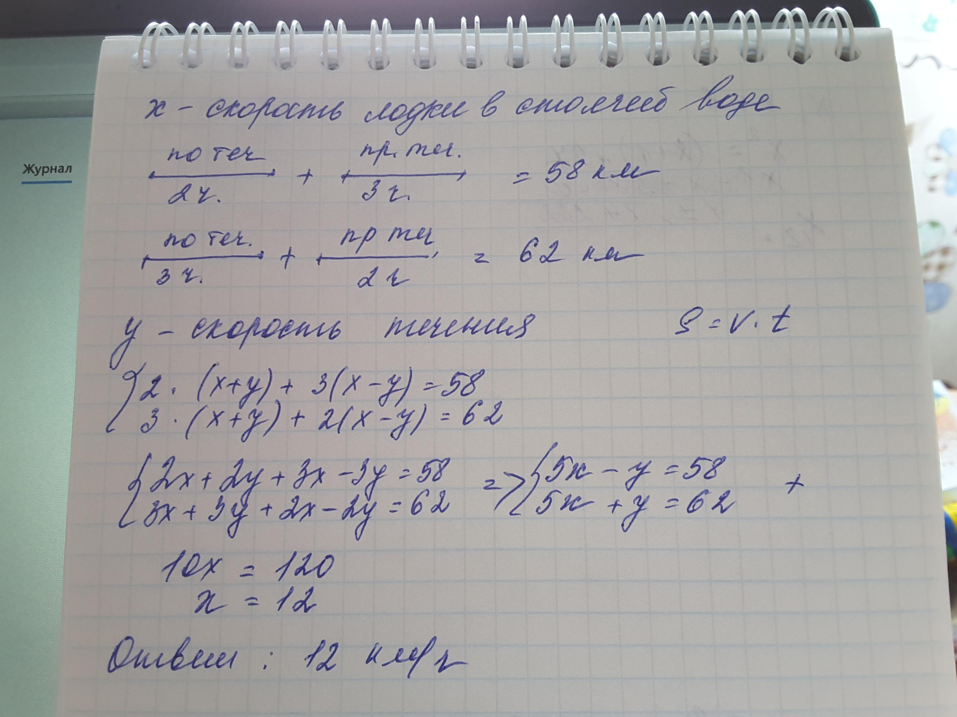 За 2 часа движения по течению и 3 часа против лодка проходит 58 км. А за 3 часа движения по течению и 2 часа против 62 км. Найти скорость лодки в стоячей воде.