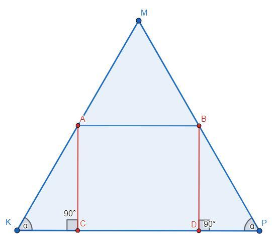 В треугольнике kpm km=mp. точки a и b середины сторон KM и MP соответственно AC и BD перпендикулярны прямой KP. Докажите что треугольники KAC и DBP равны