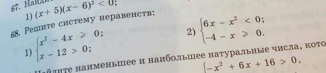 Решением первого неравенства будут два интервала (-∞;0]∪[4;+∞), они находятся с помощью метода интервалов, приравниваем к нулю левую часть, находим корни ноль и 4 и разбиваем корнями числовую ось на интервале, на каждом интервале ищем знаки, подставляя из этого промежутка любое число в левую часть неравенстваа.