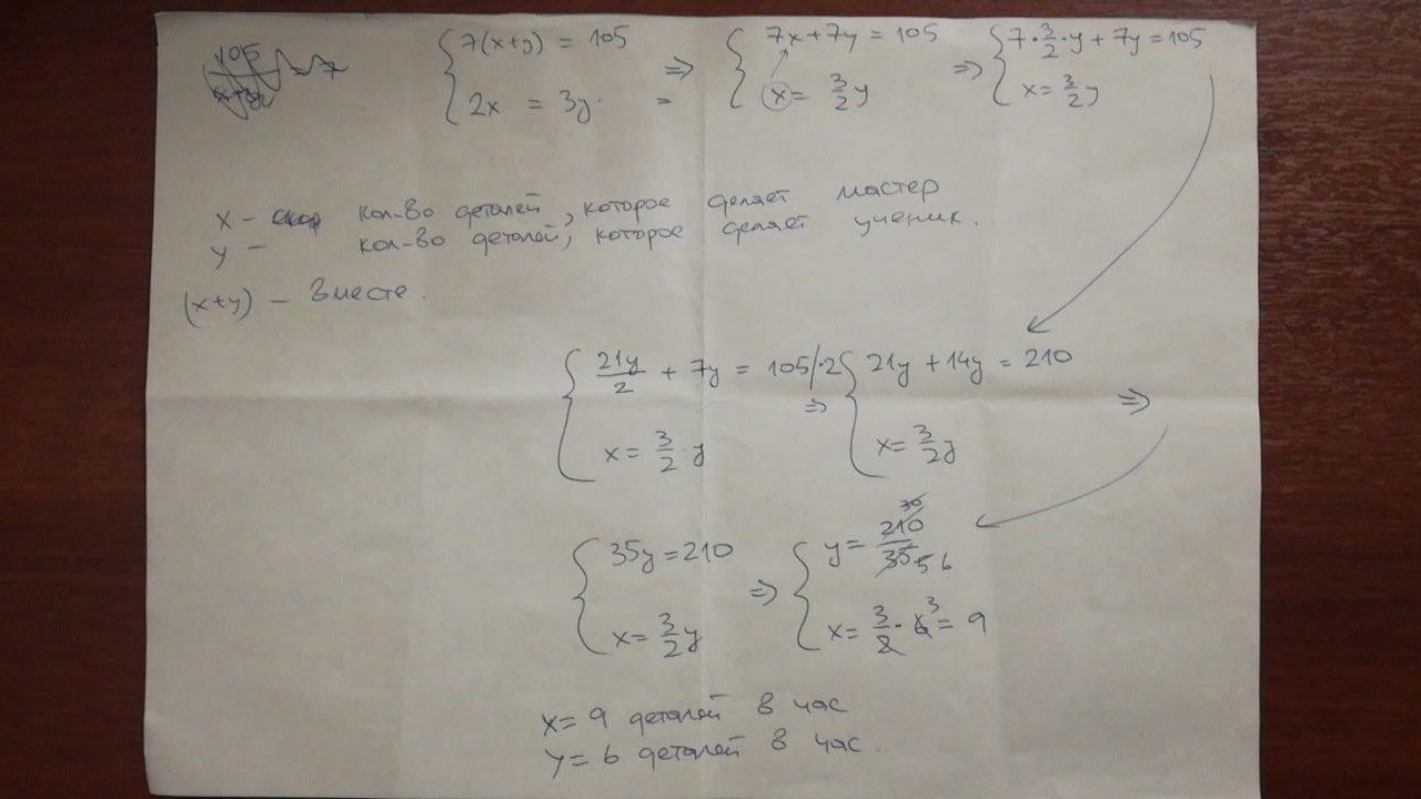 мастер и его ученик могут изготовить 105 детали за 7 ч. За 2 ч. мастер делает столько деталей, сколько его ученик делает за 3 ч. сколько за 1 час они могут сделать деталей по отдельности
