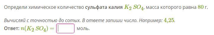 4)Определи химическое количество сульфата калия K2SO4, масса которого равна 80 г. (рис.4)