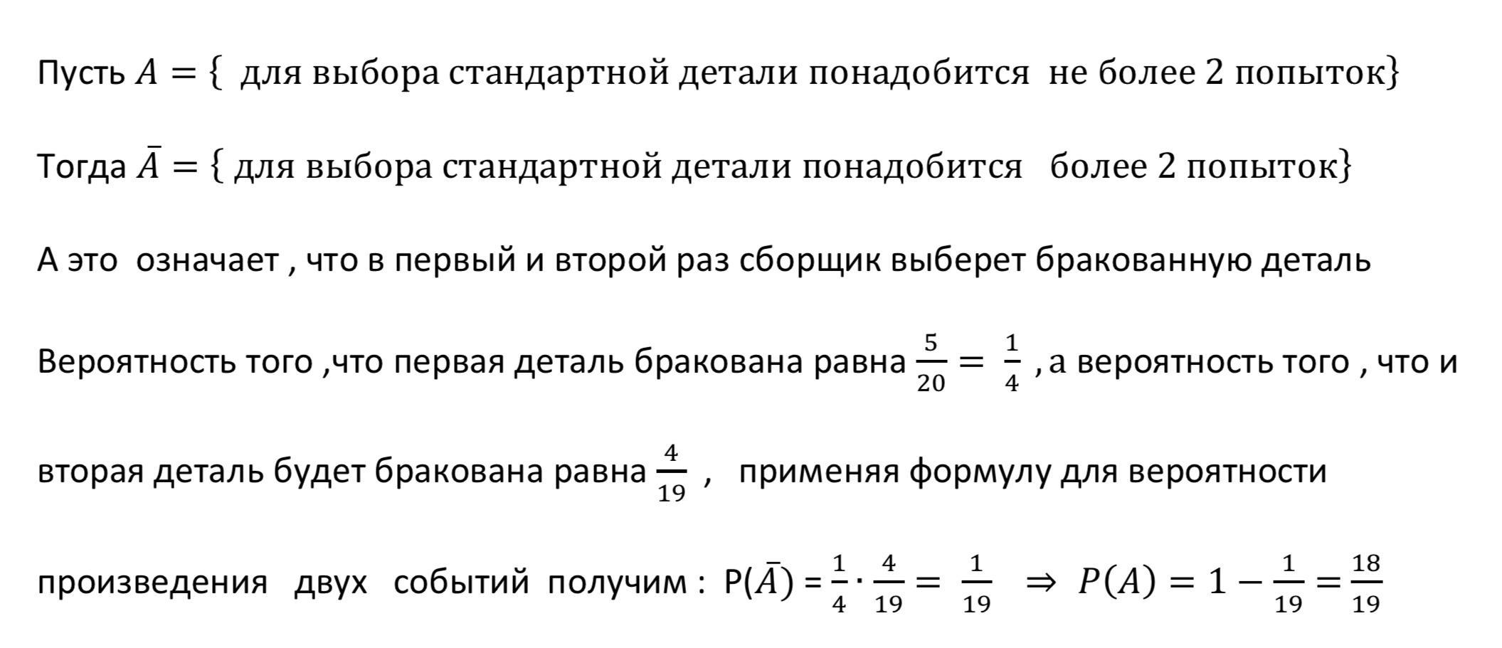1) Если сборщик из двух попыток вынул две стандартных деталей. Вероятность того, что он возьмет первую стандартную деталь равна 15/20 = 3/4, вероятность выбрать вторую стандартную деталь равна 14/19. По теореме умножения, вероятность равна 3/4 * 14/19 = 21/38