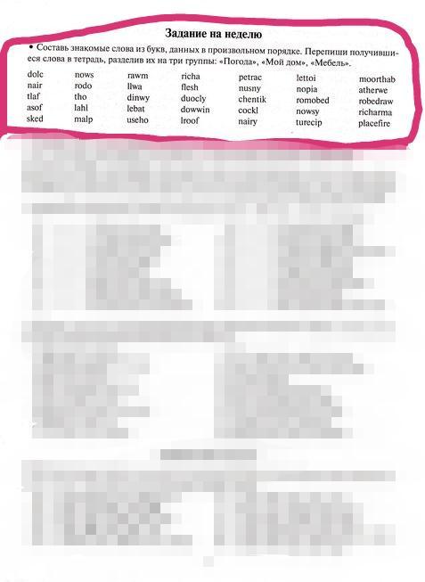 * Составь знакомые слова из букв, данных в произвольном порядке. Перепиши получившиеся слова в тетрадь, разделив их на три группы: «Погода», «Мой дом», «Мебель».