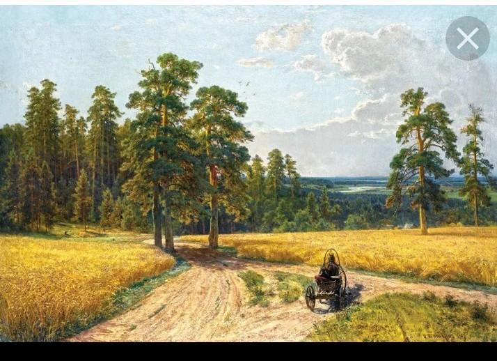 Перед нами открывается золотое поле со спелой рожью. Тучные колосья уже готовые к сбору урожая, колышутся под легким дуновением ветерка. А в некоторых местах, особенно по обочине, много золотых колосьев под своей тяжестью наклонилось к земле. Легкое колыхание колосьев, как бы передает аромат созревшего урожая. На переднем плане картины берет свое начало извилистая полевая дорога. По ней едет повозка. Она, как бы остановилась у развилки. Возможно,возница размышляет куда же ему повернуть. Дорога, извиваясь, уходит вдаль вглубь соснового леса.Как всегда в работах художника, человек на фоне природы выглядит хрупким и маленьким. Высокие сосны, залитые солнечным светом, величественно возвышаются вдалеке. Небо над лесом покрыто легкими облачками..