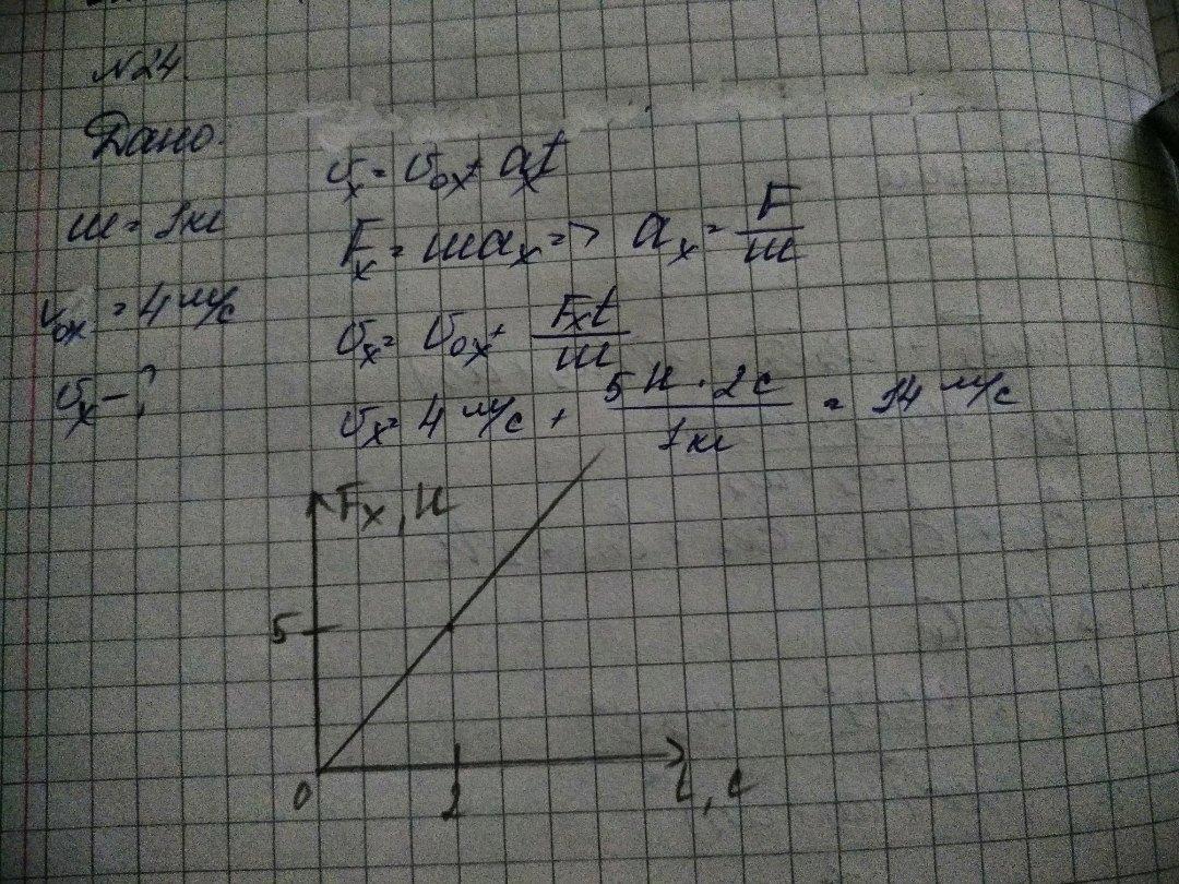К телу массой 1 кг, движущемуся прямолинейно по гладкой горизонтальной поверхности, приложена по направлению его движения сила, изменяющаяся по линейному закону. Определить конечную скорость тела, если проекция начальной скорости равна 4 м/с (график во вложении)