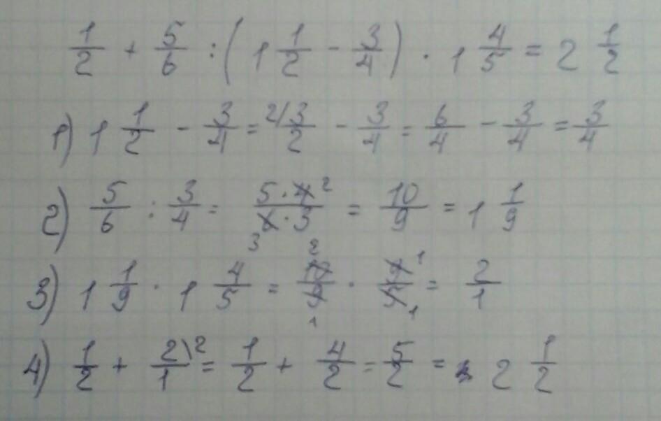 = 1/2 + 5/6 : (3/2 - 3/4) * 9/5 = 1/2 + 1/6 : 3/4 * 9 = 1/2 + 1/6 * 4/3 * 9 = 1/2 + 1/3 × 2 × 3 = 1/2 + 2 = 5/2 = 2 1/2