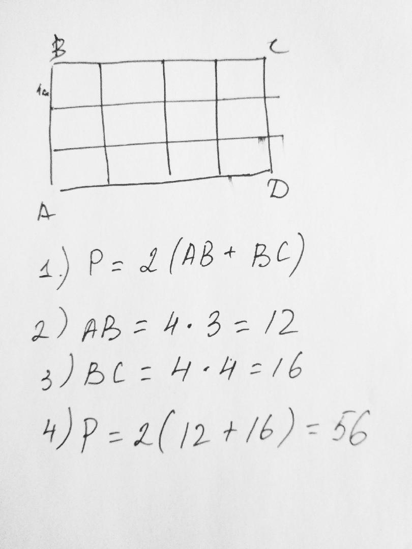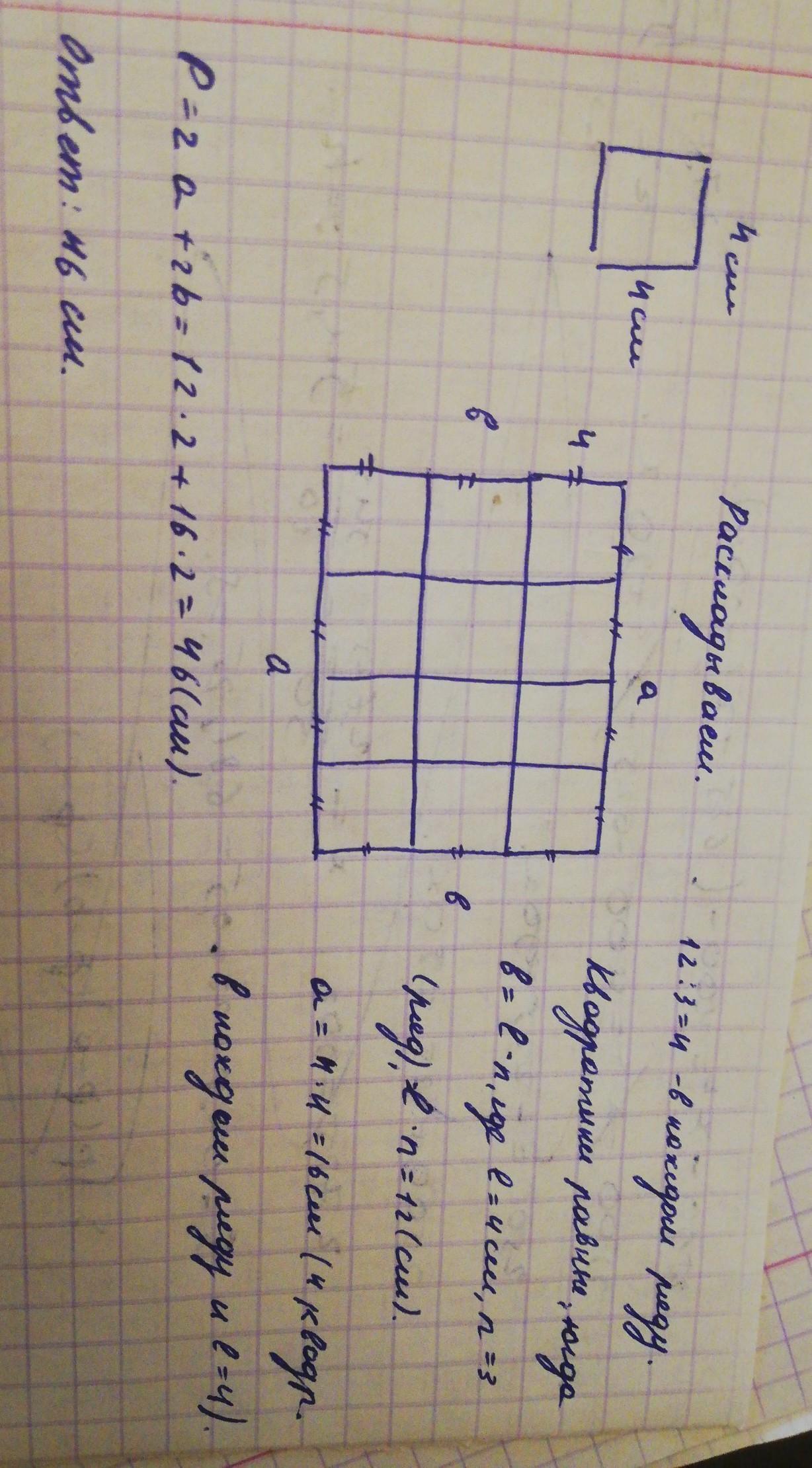 Найдите периметр прямоугольника,состоящий из12 квадратиков со стороной 4см,разложенных в 3 ряда в равном количестве нарисуйте соответствующий рисунок