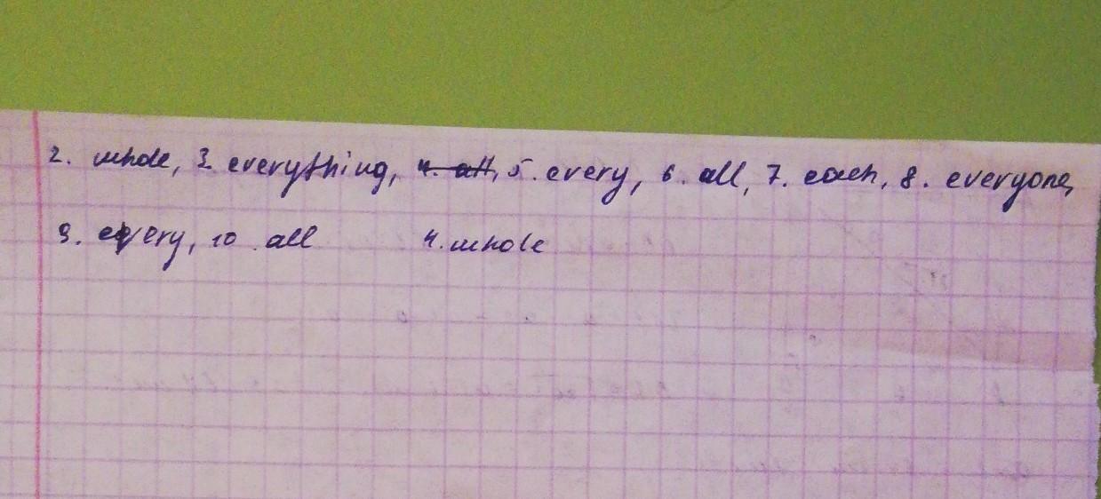 Fill in: each, every, everyone, everything, all or whole 1) Everyone needs to relax and Mrs. Emms was no different. She had worked 2) ______ year without a break and she was ready for a holiday. 3) ______ was planned, the 4) ______ family were going to spend a week together in a cabin in the mountains. 5) ______ year they had talked about getting away together but somehow they had never got round to it. This year it was actually going to happen. It had been seven years since 6) ______ the family had gone away together and Mrs. Emms was really looking forward to the holiday. They had rented the cabin and had planned a different outing for 7) ______ day of the week. There would be something for 8) ______ Mrs. Emms just wanted a quiet relaxing holiday and to be able to spend 9) ______ day in the fresh air. The rest of the family had different interests but they had planned the holiday well so that they would 10) ______ enjoy themselves.