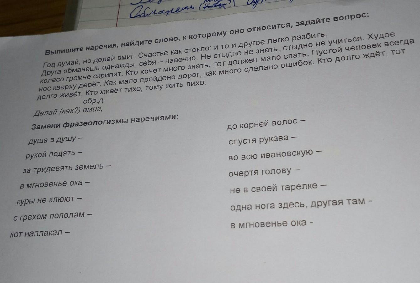 душа в душу- хорошо.рукой подать - близко. , за тридевять земель.- далеко.в мгновенье ока- быстро.куры не клюют. - много.с грехом пополам- еле-еле.кот наплакал- мало.до корней волос- .спустя рукава - лениво.во всю ивановскую- громко.очертя голову- отчаянно.не в своей тарелке - неудобно.одна нога здесь , другая там- быстро,в мнгновенье ока- быстро