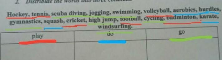 слова которые выделены красным цветом они в столбик "play", синие это "do", а зелёные это "go"