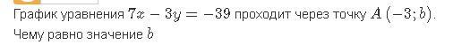 График уравнения 7x-3y=-39 проходит через точку A (-3;b) чему равно значение b