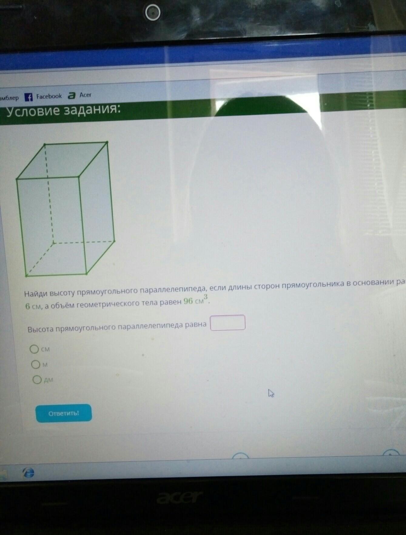 помогите пожалуйста.Вопрос: Найди найди высоту прямоугольника параллелепипеда если длины сторон прямоугольника в основании равны 4 см и 6 см объём геометрического тела равен 96 см в квадрате