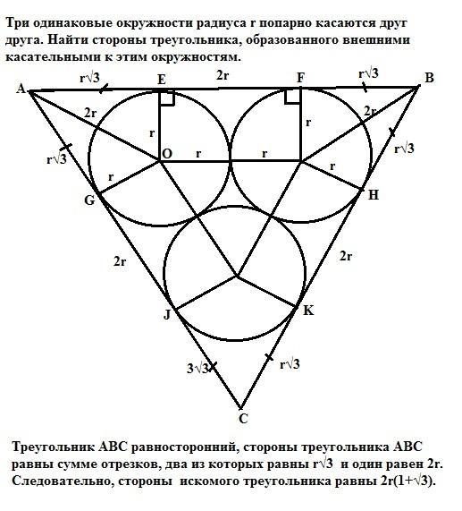 Три одинаковые окружности радиуса r попарно касаются друг друга. Найти стороны треугольника, образованного внешними касательными к этим окружностям.