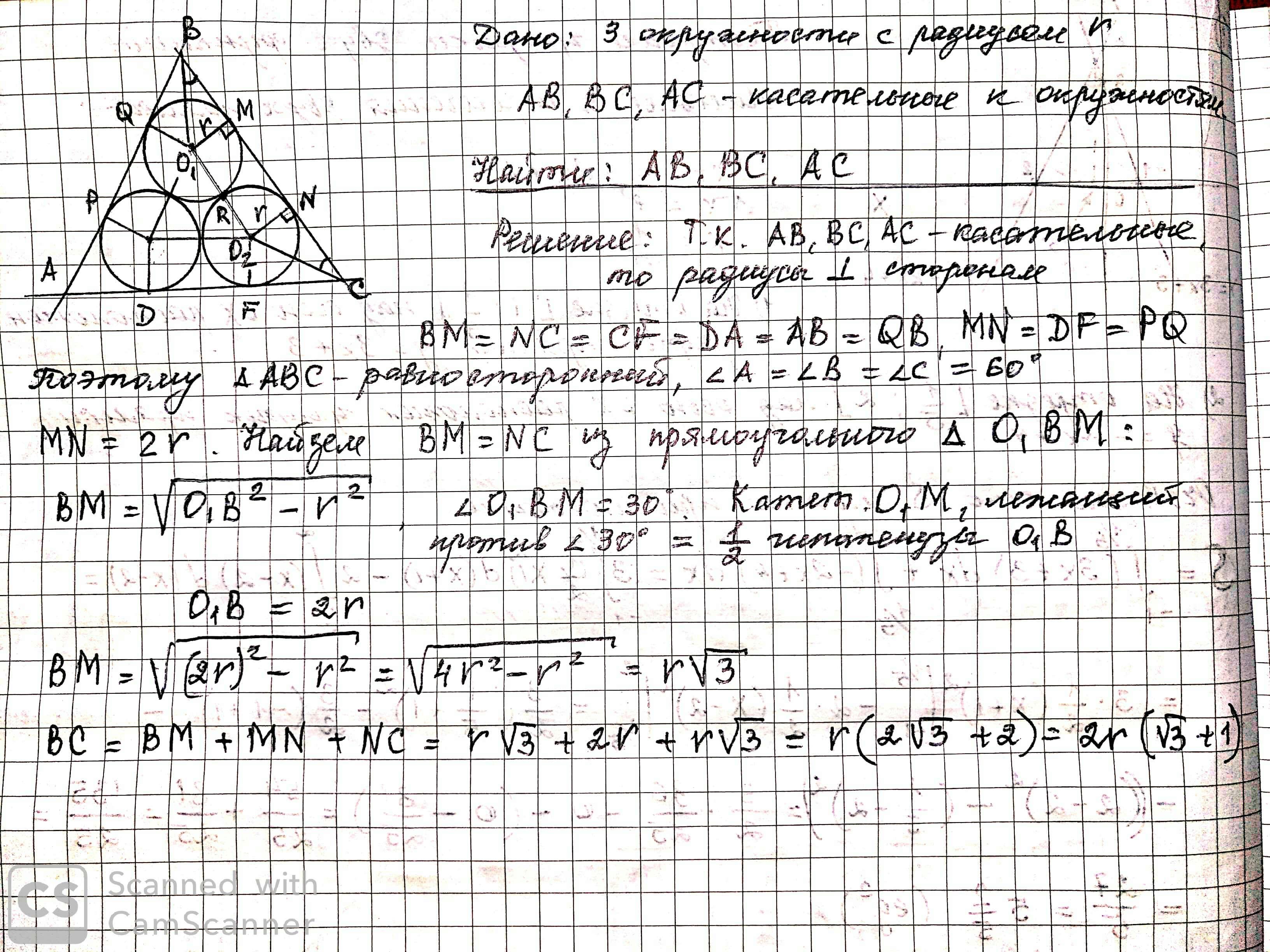 АВ, АС и ВС - касательные к попарно касающимся окружностям радиуса r.