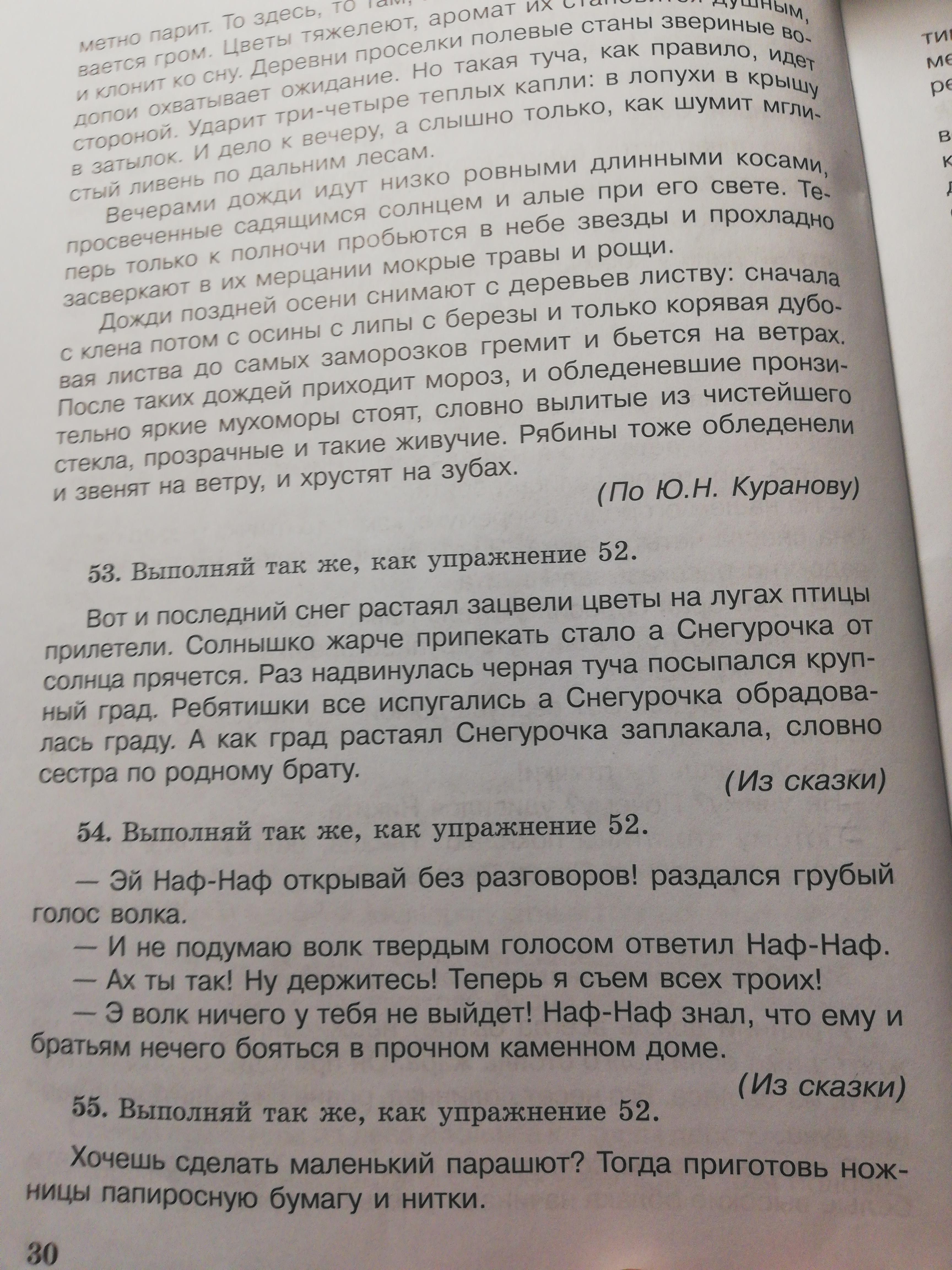 Ответ:53.Вот и последний снег растаял, зацвели цветы на лугах, птицы прилетели. Солнышко жарче припекать стало, а Снегурочка от солнца прячется. Раз надвинулась чёрная туча посыпался крупный град. Ребятишки все испугались, а Снегурочка обрадовалась граду. А как град растаял Снегурочка заплакала, словно сестра по родному брату.
