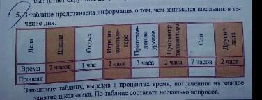 Ответ: школа 29,16% , отдых: 4,16 %, игра на компьютере: 8,32%, приготовление уроков: 12,48%, сон: 29,16%, другие дела: 8,32%