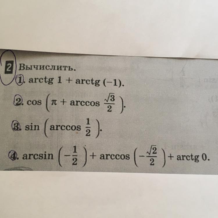 4) arcsin(-1/2)+arccos(-√2/2)+arctg0=-π/6+(π-π/4)+0=3π/4-π/6=7π/12