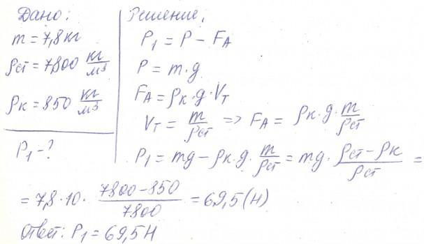 Стальную деталь массой 7,8 кг плотностью погружают в керосин Чему равен вес детали в керосине плотность стали 7800 кг на метр кубический плотность керосина 850 кг на метр кубический пожалуйста сроооооооочно надооооо заранее спасибо