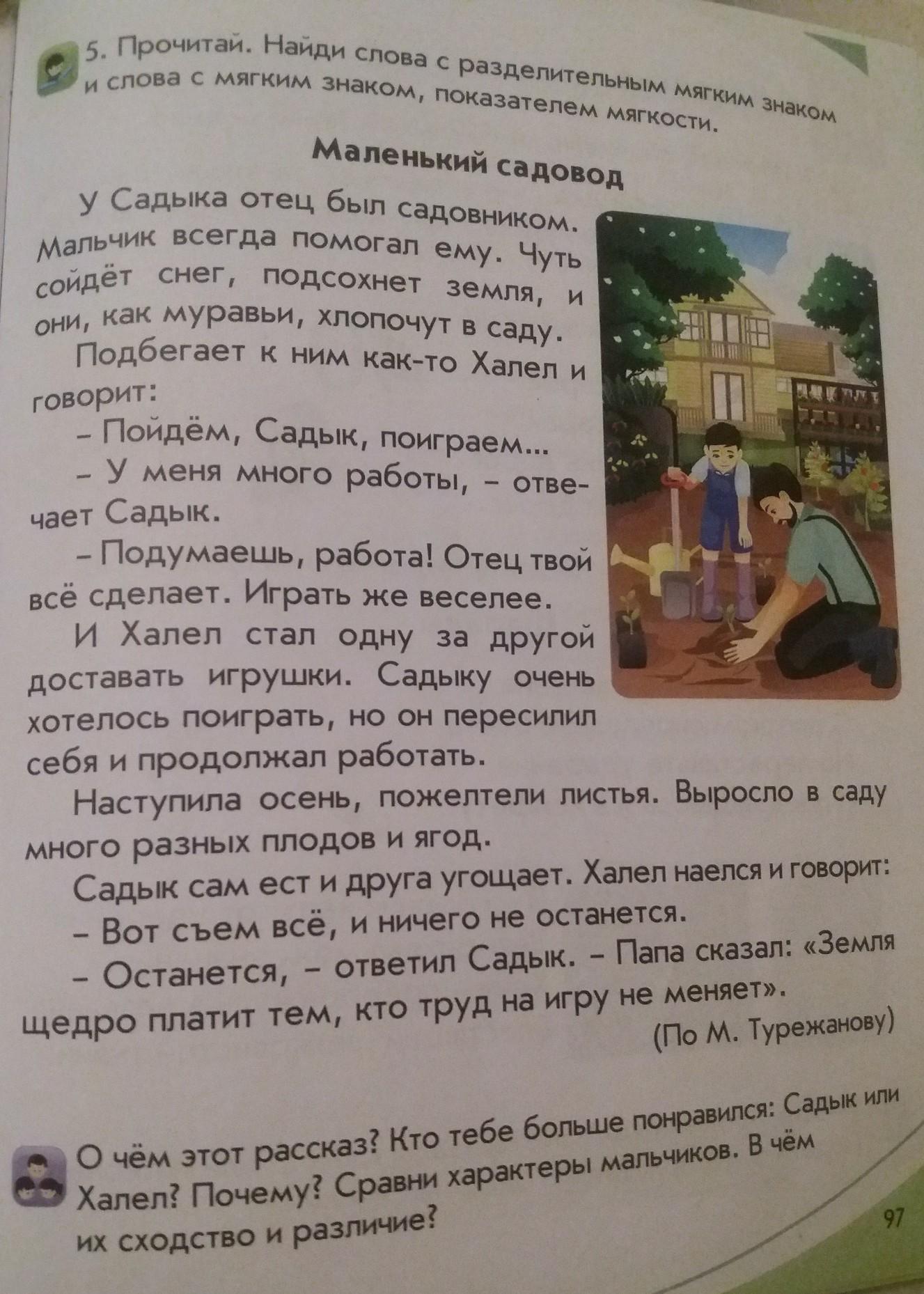 Ответ:Мне больше понравился Садык потому что он больше проводил времени за садом то есть помогал папе ( это хорошо ) потому что за его труд отблагодарила природа:ягодами и плодами.А Халел просто хотел играть.