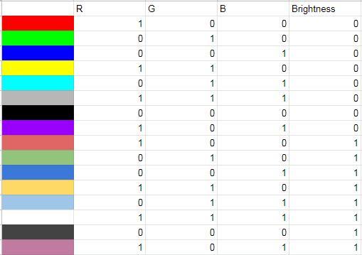 Цвет обычно кодируется значением красного(R), зеленого(G) и синего(B). В четырехбитной палитре оставшийся бит отвечает за яркость. Или за смену палитры, зависит от машины.У нас он будет отвечать за яркость. Составим таблицу: