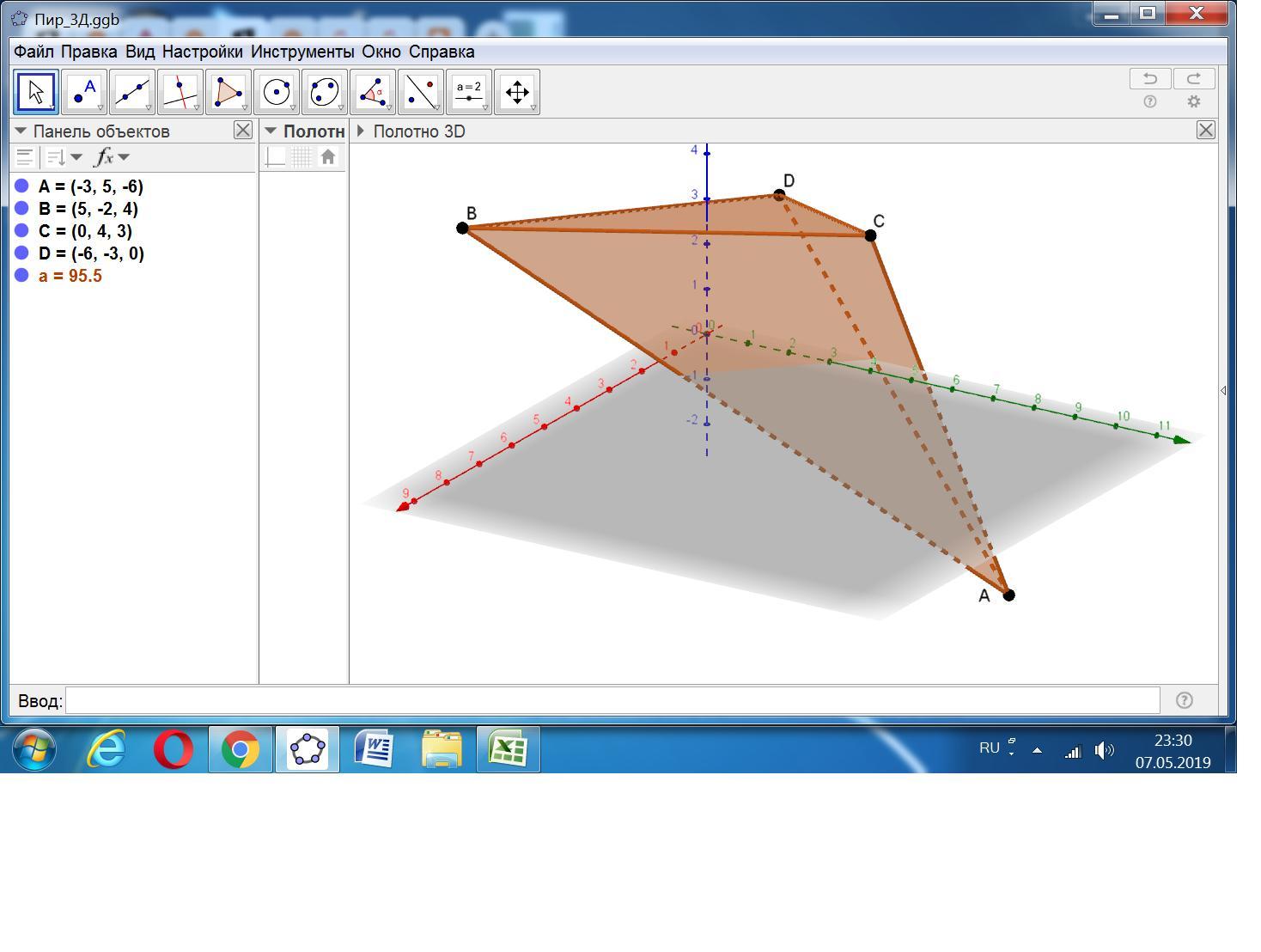 Пирамида строится в трёхмерной системе координат по заданным координатам x, y, z.