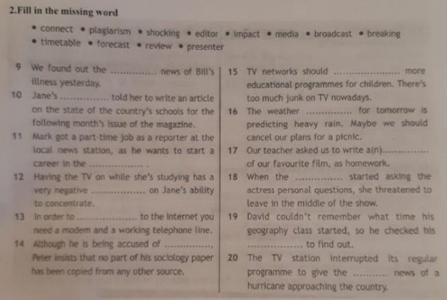 Объяснение: 9 – breaking; 10 – editor; 11 – media; 12 – impact; 13 – connect; 14 – plagiarism; 15 – broadcast; 16 – forecast; 17 – review; 18 – presenter; 19 – timetable; 20 – shocking.